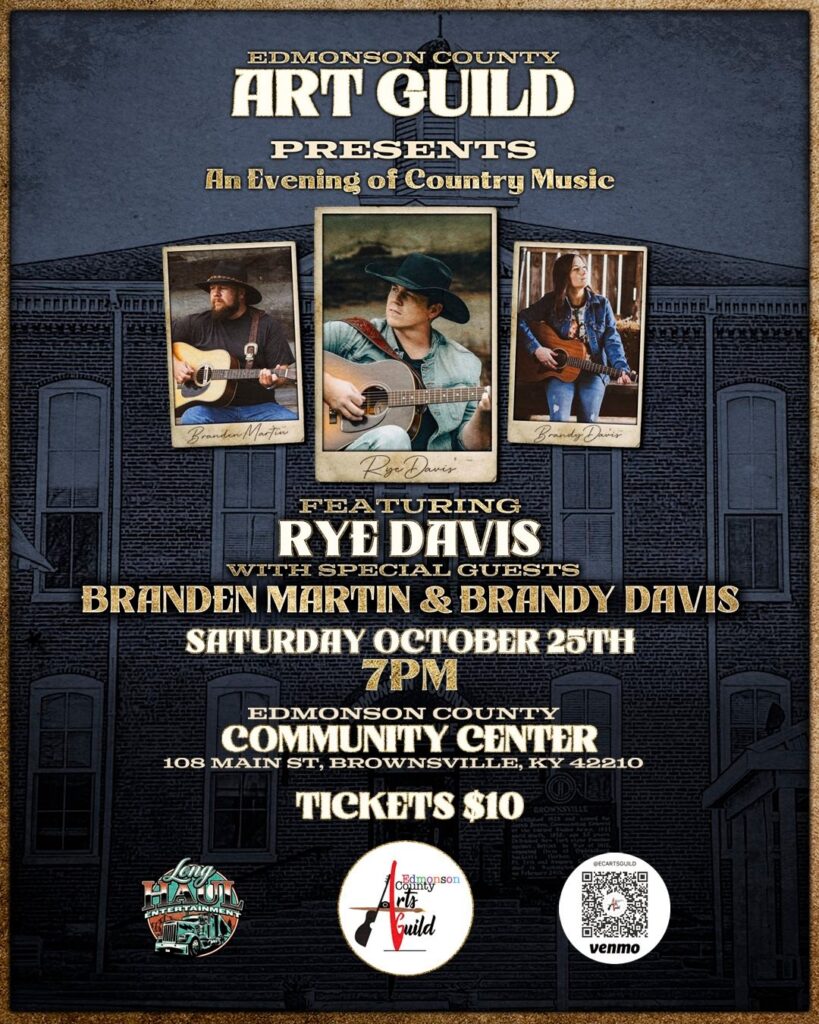 The Edmonson County Art Guild presents An Evening of Country Music featuring Rye Davis, with special guests Branden Martin & Brandy Davis on Saturday, October 25th at 7 PM.