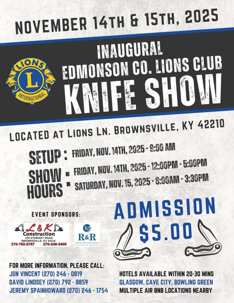 Attend the inaugural KNIFE SHOW hosted by the Edmonson County Lions Club on Friday, November 14th from 12:00 PM – 5:00 PM and Saturday, November 15th from 8:00 AM – 3:30 PM.