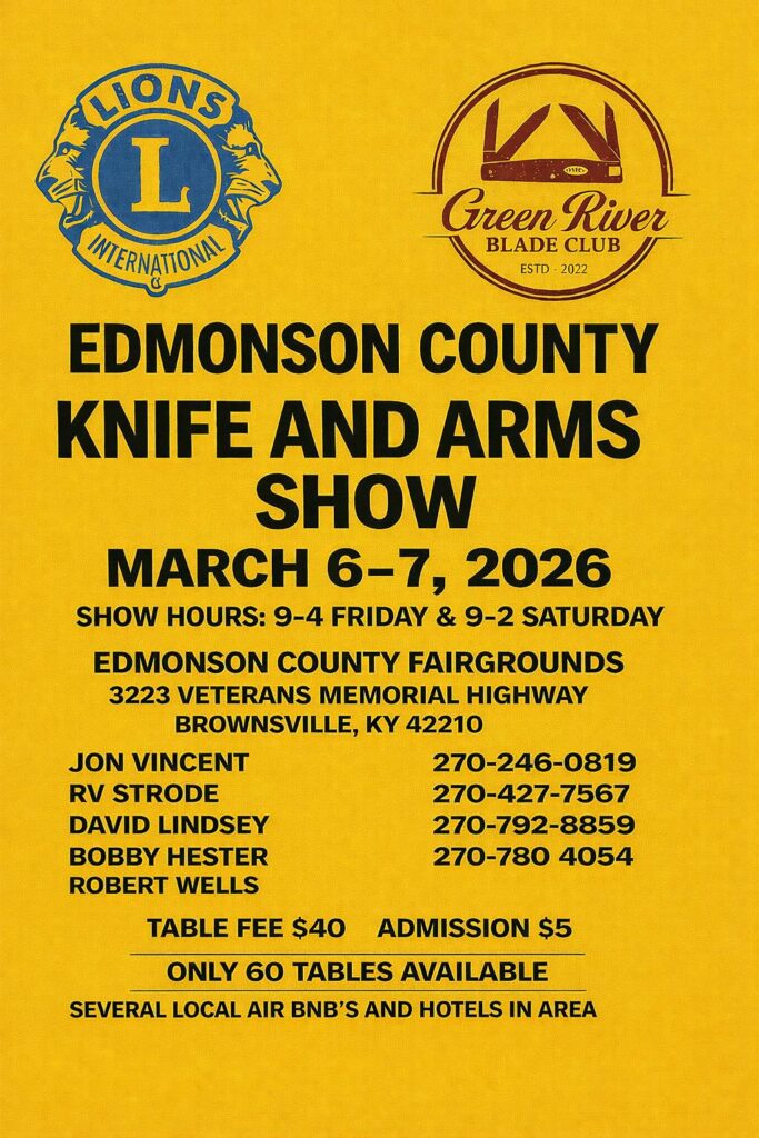 Join the Edmonson County Lions Club and Green River Blade Club for the Knife and Arms Show on March 6-7th, 2026 at the Edmonson County Fairgrounds. For lodging information, please visit Edmonson County Lodging | Hotels and Lodging Near Mammoth Cave
