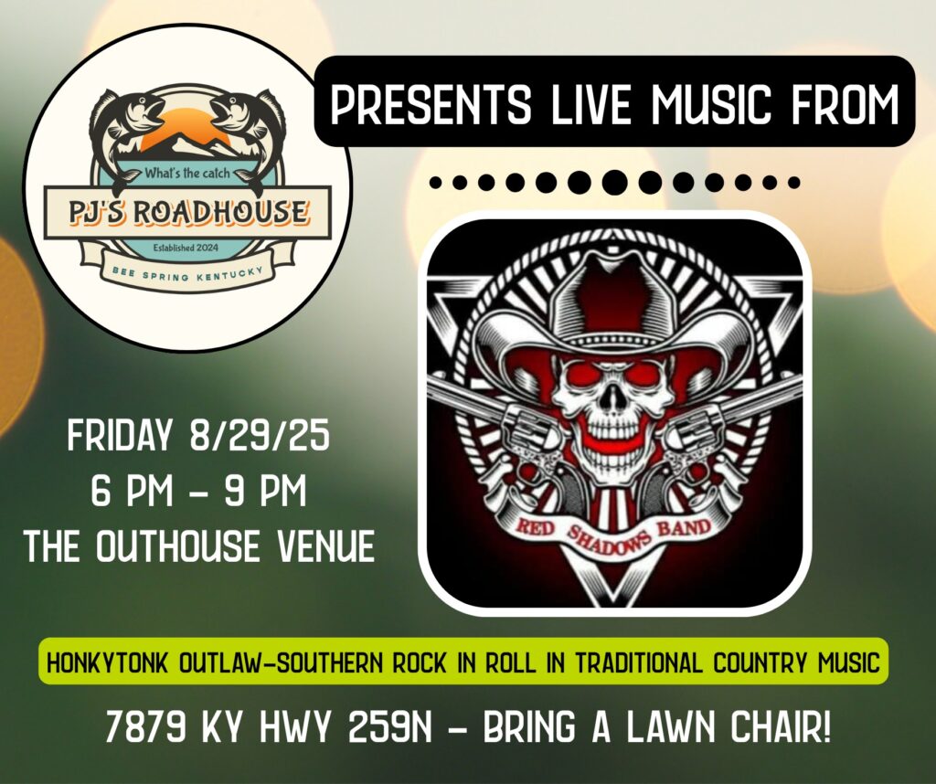 PJ’s Roadhouse presents LIVE music in their backyard at The Outhouse venue THIS Friday, August 29th from 6 PM – 9 PM. Visit for dinner and stay for tunes! Enjoy the self-proclaimed “Honkytonk Outlaw Southern Rock in Roll in Traditional Country Music” with the Red Shadows Band. Please bring a lawn chair!