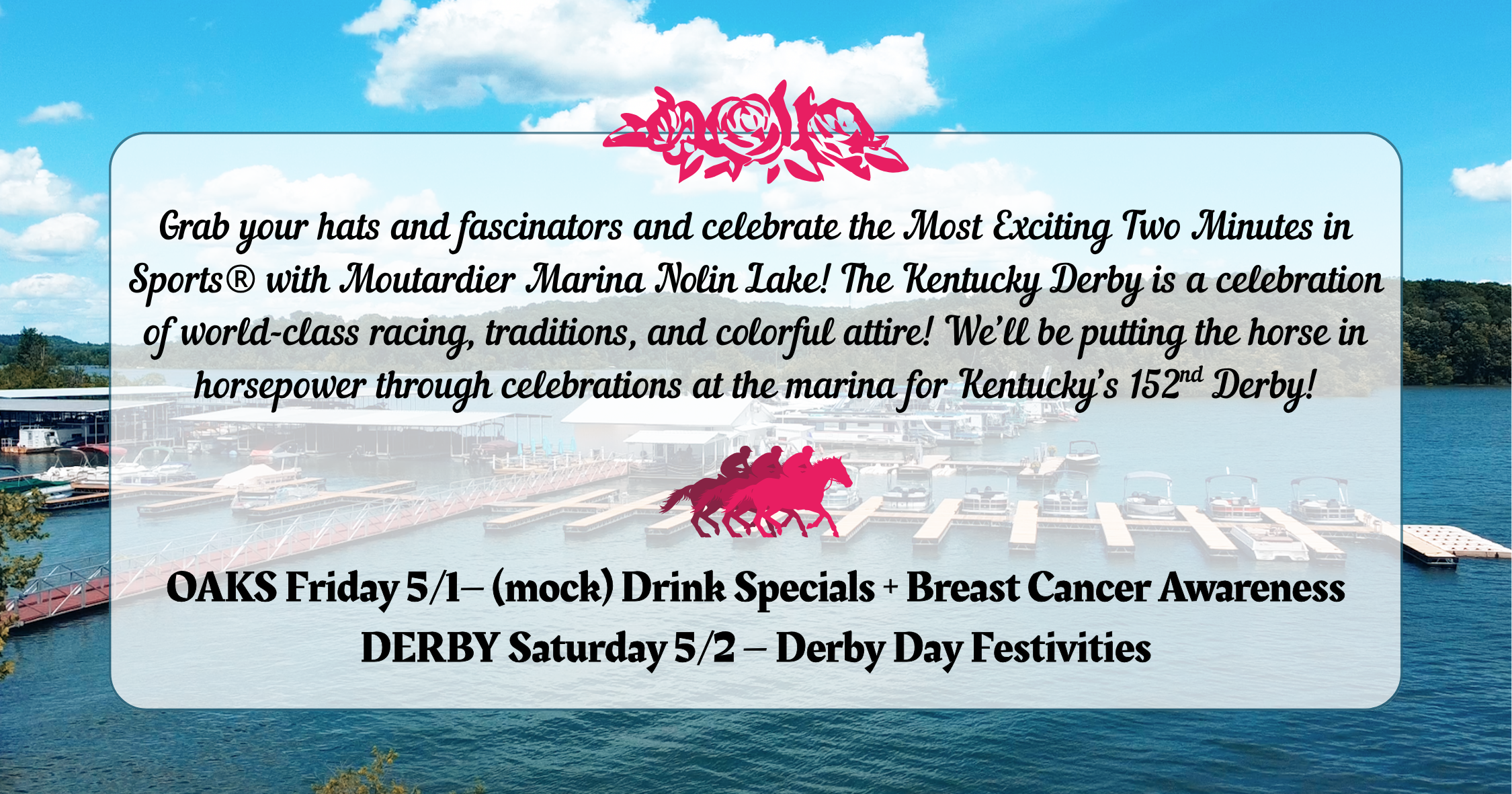 Join Moutardier Marina Nolin Lake as they put the horse in horsepower through celebrations at the marina for Kentucky’s 152nd Derby, noted as the Most Exciting Two Minutes in Sports®…